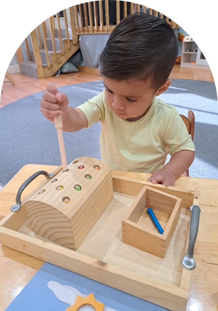 Our Montessori Toddler environment is designed for children 18 months to three years of age. It is a place for toddlers to discover their independence in a safe and purposefully planned classroom while working with age appropriate lessons and enjoying second language instruction as part of their curriculum. The Toddler school day begins with individual instruction and independent work for a period of about 2 hours. The toddlers frequently work in small groups, or with a teacher who presents lessons according to child-readiness. Midmorning, the children gather as a group for snack time where they assist in the preparation of the snack and table setting.